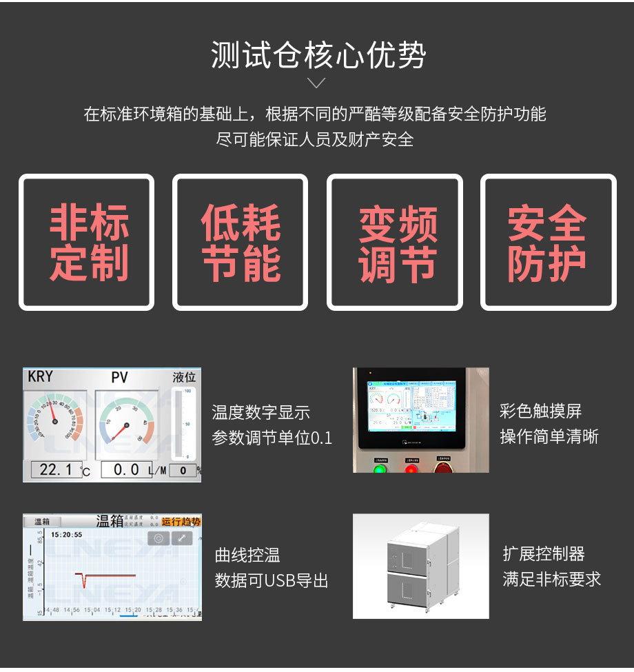 本試驗箱適用于整機或大型零部件的低溫、高溫、高低溫變化、恒定濕熱、高低溫交變濕熱等試驗??筛鶕?jù)用戶要求改變工作室尺寸與功能,采用拼塊式箱體,造型美觀大方,科學的風道設計,能滿足不同客戶的需求。;變頻自定算法控制,機組運行綜合節(jié)能35%以上...