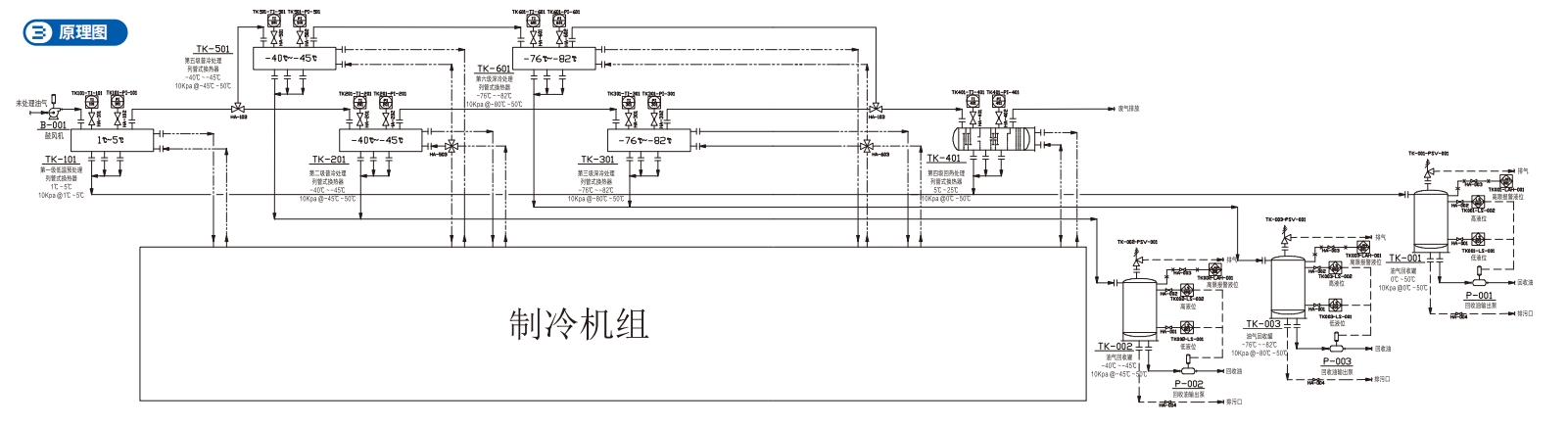 將揮發(fā)VOCs?體導(dǎo)?到設(shè)備冷箱(設(shè)置冷凝溫度 3℃? -40℃? -75℃? -115℃)可以定制其他溫度區(qū),根據(jù)需求進?逐級冷凝液化。部分連續(xù)?產(chǎn)?藝在低溫段做雙路切換?藝(?側(cè)冰堵后,直接切換到另?路換熱冷箱冷凝,同時冰堵側(cè)做融霜處理)。
