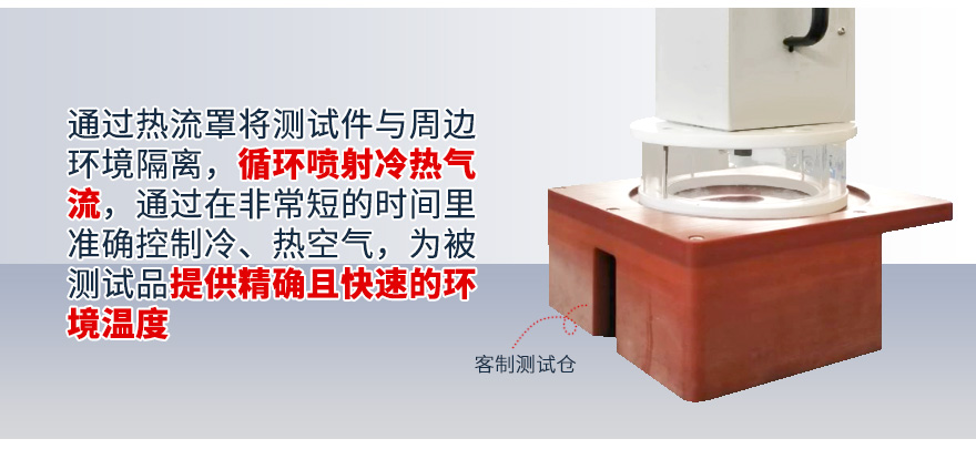 1、試驗(yàn)機(jī)輸出氣流罩將被測(cè)試品罩住,形成一個(gè)較密閉空間的測(cè)試腔,試驗(yàn)機(jī)輸出的高溫或低溫氣流,使被測(cè)試品表面溫度發(fā)生劇烈變化,從而完成相應(yīng)的高低溫沖擊試驗(yàn);