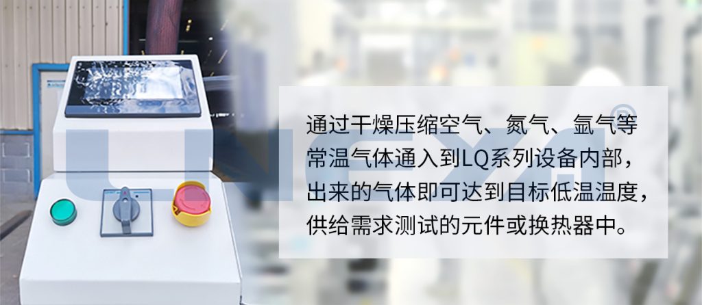 將氣體(無腐蝕)降溫使用:如干燥壓縮空氣、氮?dú)?、氬氣等常溫氣體通入到LQ系列設(shè)備內(nèi)部,出來的氣體即可達(dá)到目標(biāo)低溫溫度,供給需求測試的元件或換熱器中。